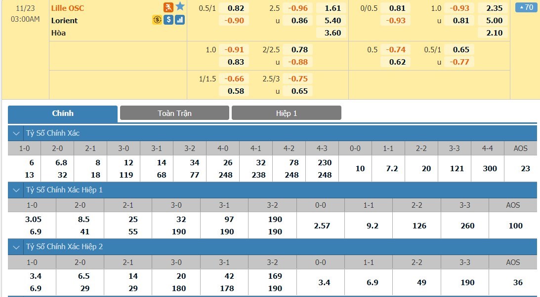 Tỷ lệ kèo cá cược bóng đá trận Lille OSC vs Lorient