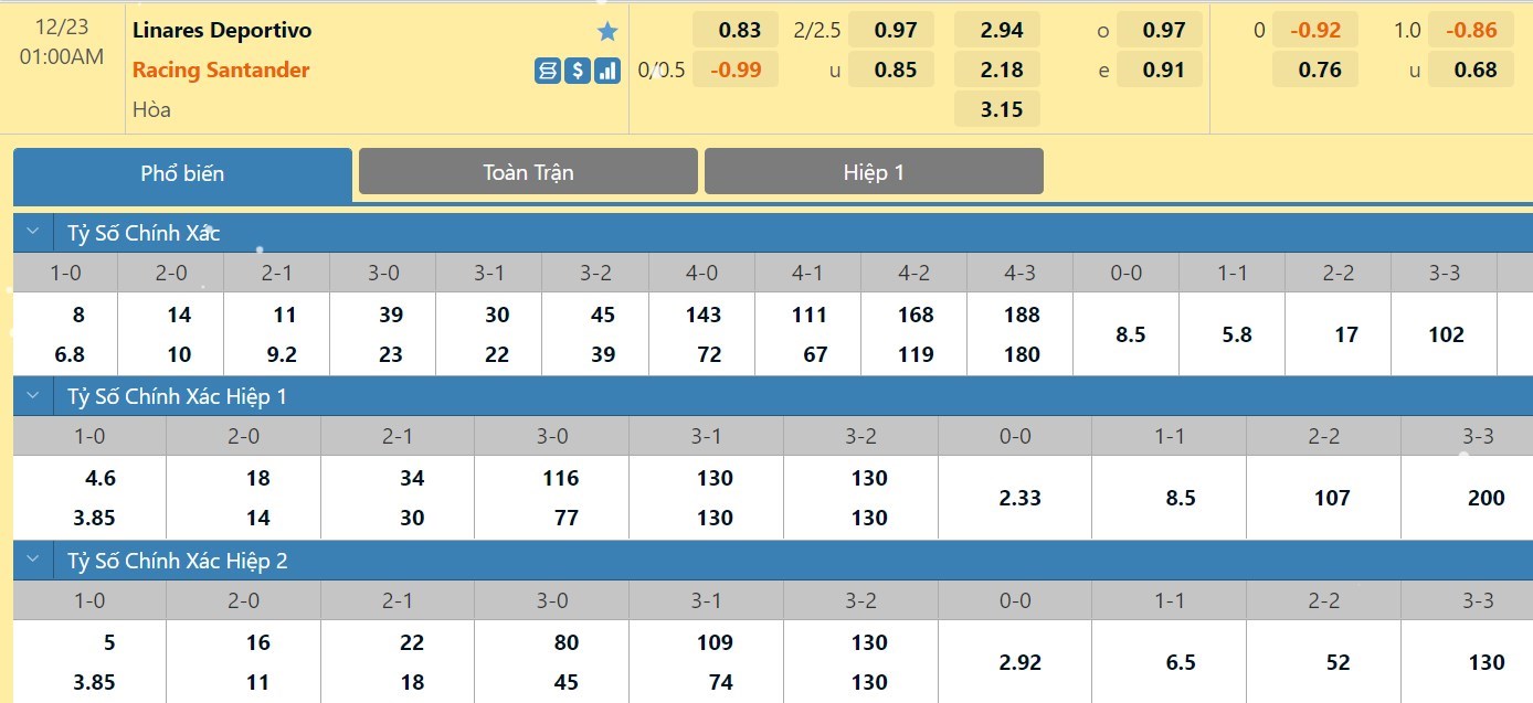 Tỷ lệ kèo cá cược bóng đá trận Linares Deportivo vs Racing Santander