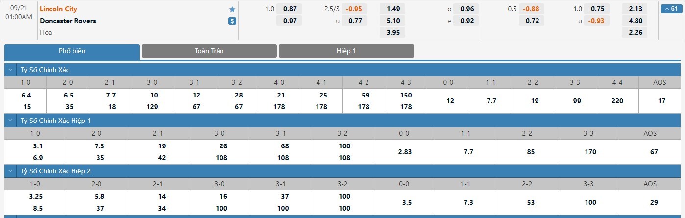 Tỷ lệ kèo cá cược bóng đá trận Lincoln City vs Doncaster Rovers
