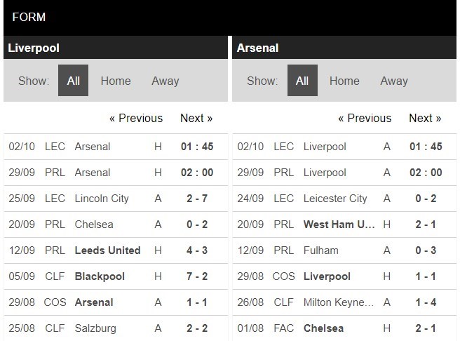 Thống kê phong độ Liverpool vs Arsenal