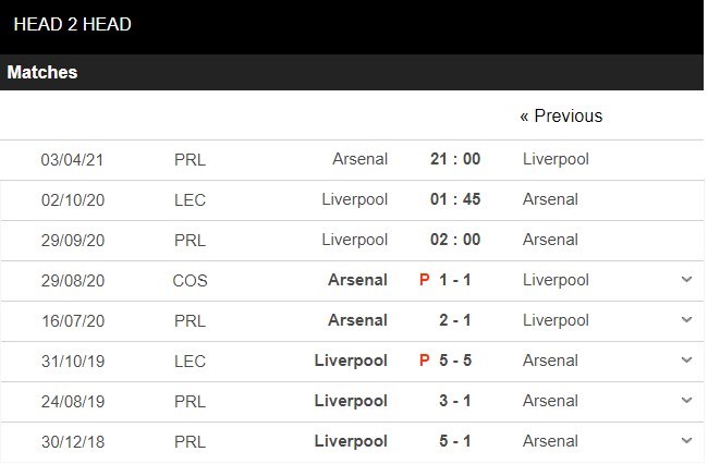 Thống kê đối đầu Liverpool vs Arsenal