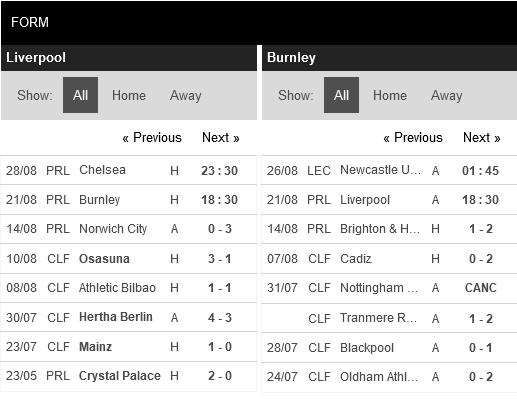 Thống kê phong độ Liverpool vs Burnley