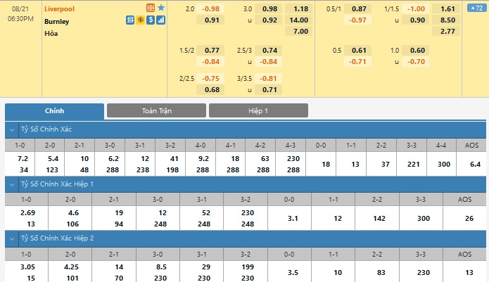 Xem tỉ lệ kèo cá cược bóng đá trực tuyến Liverpool vs Burnley