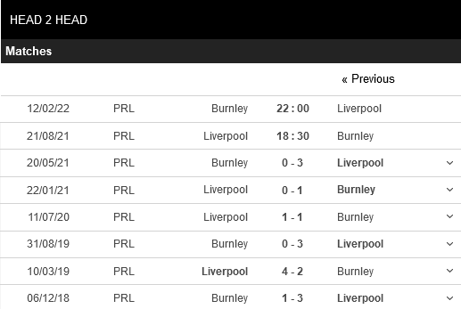 Thống kê đối đầu Liverpool vs Burnley