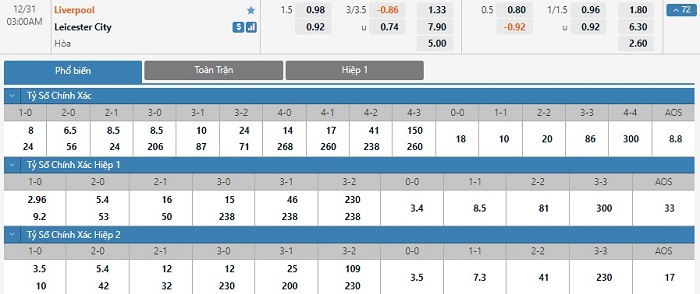 Tỷ lệ kèo cá cược bóng đá trực tuyến trận Liverpool vs Leicester