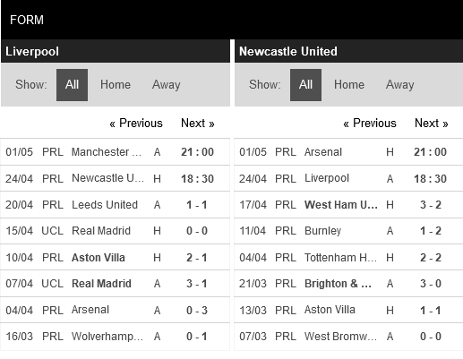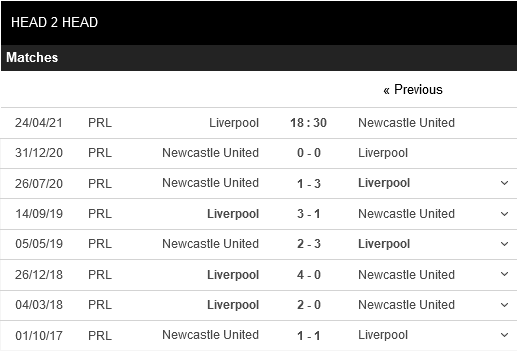 Thống kê đối đầu Liverpool vs Newcastle United