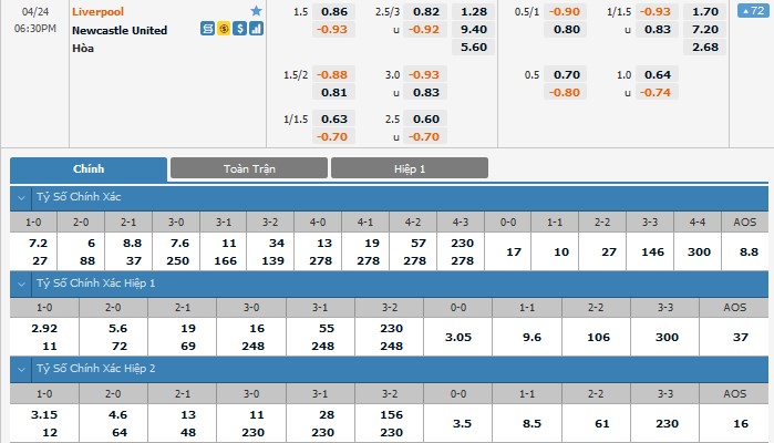 Xem tỉ lệ kèo cá cược bóng đá trực tuyến Liverpool vs Newcastle United