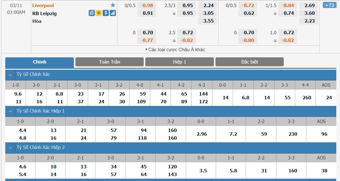 Xem tỷ lệ kèo cá cược bóng đá trực tuyến Liverpool vs RB Leipzig