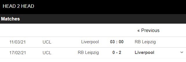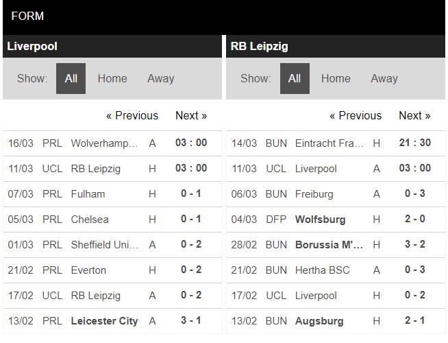 Thống kê đối đầu Liverpool vs RB Leipzig