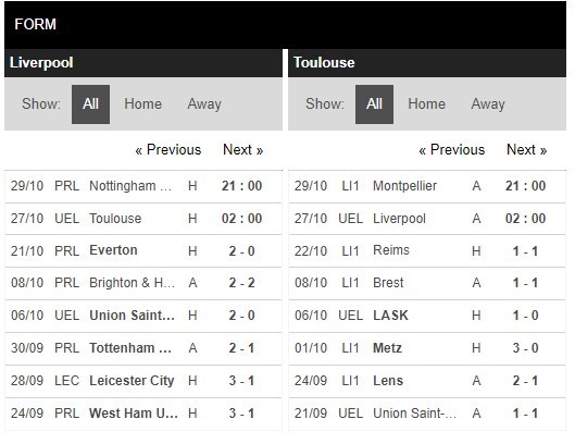 Liverpool đang đứng đầu bảng E vòng bảng Europa League với 2 trận toàn thắng. Họ đang hơn đội xếp thứ 2 Toulouse khoảng cách 2 điểm. Nếu như giành thắng lợi trong cuộc đối đầu trực tiếp với Toulouse sắp tới thì thầy trò HLV Klopp gần như sẽ nắm chắc tấm vé đi tiếp vào vòng knock out. Không chỉ làm tốt tại đấu trường châu lục mà ở giải Ngoại hạng Anh, Liverpool đang xếp thứ 4. Qua 9 vòng đấu, Lữ đoàn đỏ giành 6 chiến thắng, 2 trận hòa và thua 1 trận. Với lợi thế sân nhà, phong độ ổn định và chất lượng đội hình vượt trội thì đánh bại Toulouse là nhiệm vụ nằm trong tầm tay đội chủ sân Anfield.