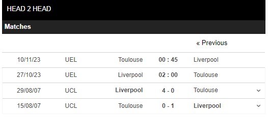 Liverpool toàn thắng cả 2 lần gần nhất gặp Toulouse. Đáng nói là trong 2 thắng lợi kể trên thì Lữ đoàn đỏ đều giữ sạch lưới. Với hàng công không được đánh giá cao của đội khách thì xem chừng rất khó để mong chờ vào chuyện bàn thắng dành cho Toulouse đến sớm. Ngược lại, Liverpool đã ghi bàn trong thời gian hiệp 1 ở 3/4 lần ra sân gần nhất.