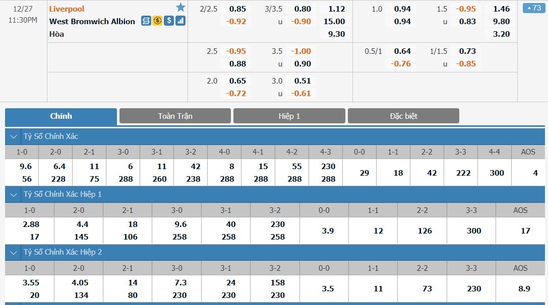 Tỷ lệ kèo cá cược bóng đá trực tuyến trận Liverpool vs West Bromwich