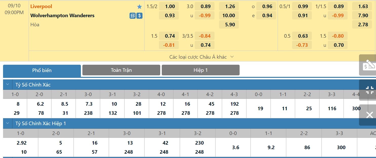 Xem tỷ lệ kèo cá cược bóng đá trực tuyến Liverpool vs Wolverhampton