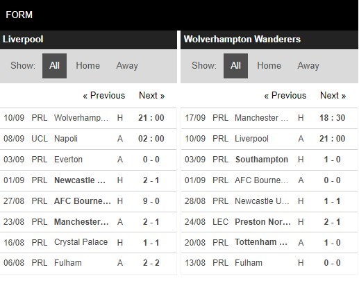 Thống kê phong độ Liverpool vs Wolverhampton