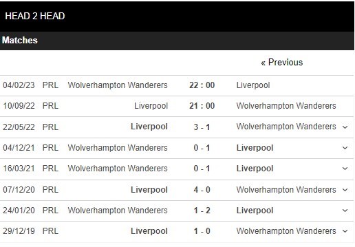 Thống kê đối đầu Liverpool vs Wolverhampton