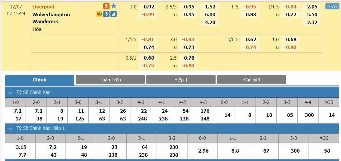 Tỷ lệ kèo cá cược bóng đá trận Liverpool vs Wolves