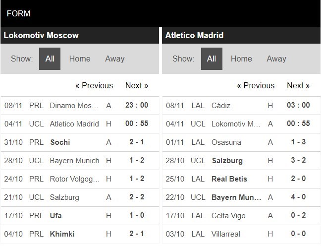 Thống kê phong độ Lokomotiv Moscow vs Atlético Madrid
