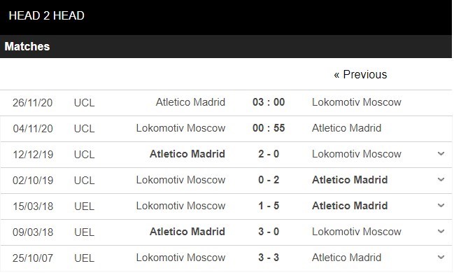 Thống kê đối đầu Lokomotiv Moscow vs Atlético Madrid