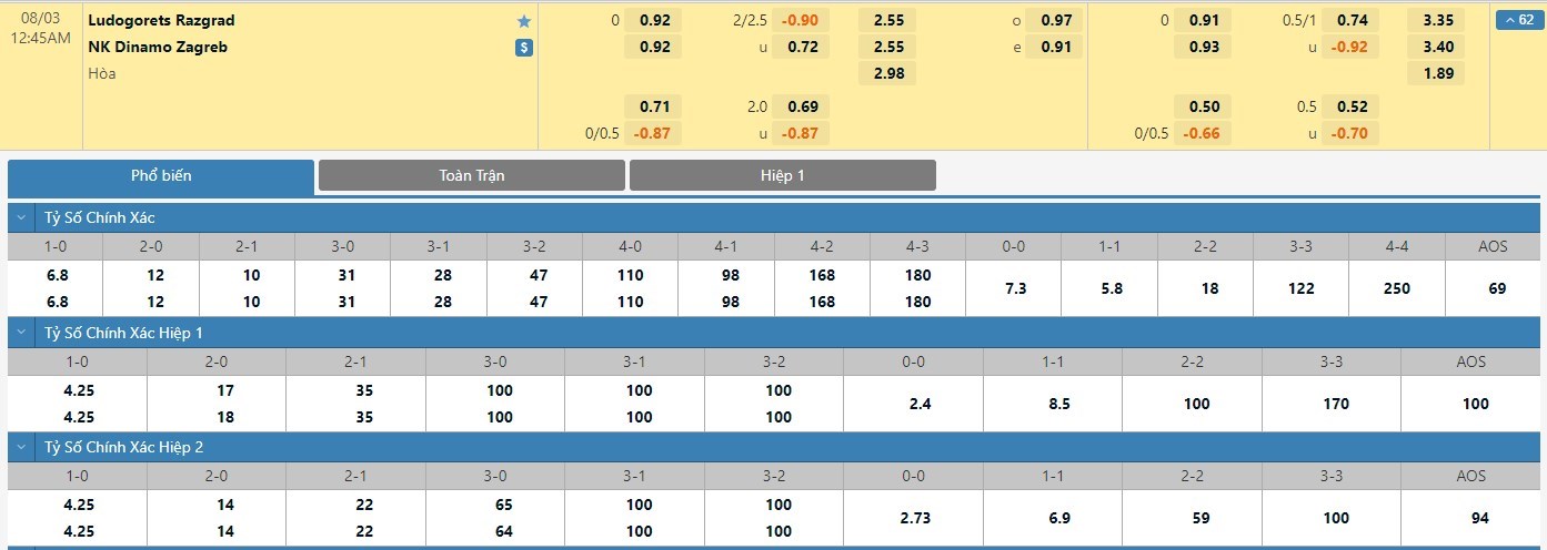 Nhà cái chỉ đưa ra kèo đồng banh ở trận đấu này. Với lợi thế được chơi trên sân nhà, mức kèo như vậy với Ludogorets Razgrad khiến rất nhiều người lo ngại. Rõ ràng Dinamo Zagreb không phải là một tay mơ. Khả năng cao hai đội sẽ chọn cách chơi thăm dò trong hiệp đấu đầu tiên chứ không quá vội vàng trong cách tiếp cận trận đấu.