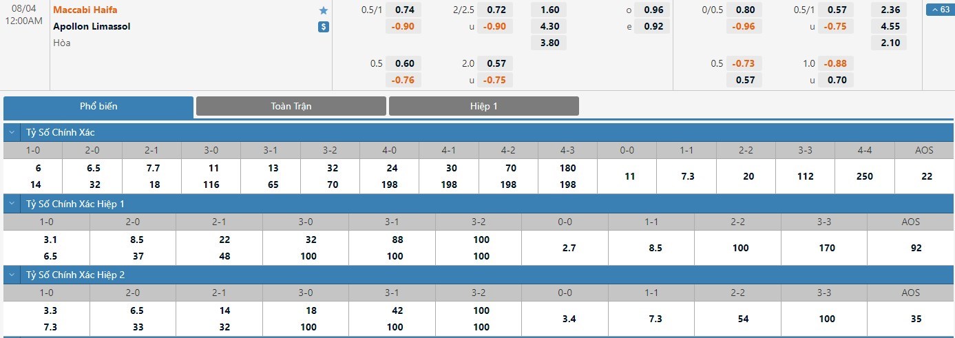 Tỷ lệ kèo cá cược bóng đá trực tuyến trận Maccabi Haifa vs Apollon Limassol