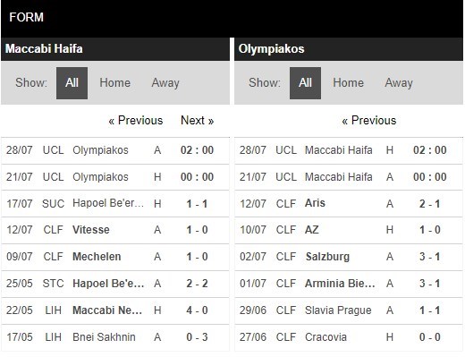 Olympiacos trong giai đoạn vừa qua cũng đã mang về được cho mình 3 thắng lợi ở 10 trận đấu gần đây nhất trên mọi đấu trường, còn lại là 3 trận hòa và chỉ phải nhận 4 thất bại. Đoàn quân của HLV Pedro Martins đương nhiên vẫn được đánh giá cao hơn trong cuộc đối đầu này và họ sẽ cần phải cố gắng mang về cho mình lợi thế ở cuộc đối đầu này để dễ dàng hơn trong việc triển khai thế trận ở lượt về. Nhìn chung, vị thế của thầy trò Pedro Martins được đánh giá cao hơn rất nhiều so với Haifa phía bên kia, nhờ một giàn hào thủ có chiều sâu và chẳng ít những tên tuổi đã nhẵn mặt ở những sân chơi tầm cỡ Châu Lục.