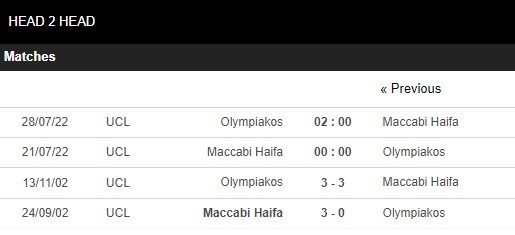 Thống kê đối đầu Maccabi Haifa vs Olympiacos