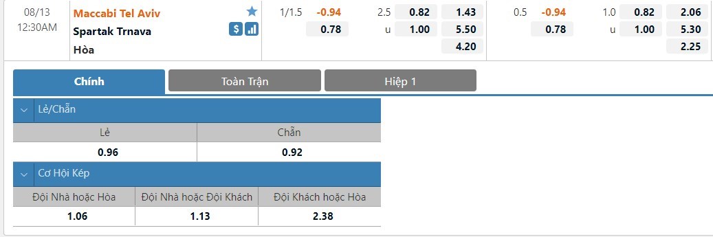 Tỷ lệ kèo cá cược bóng đá trận Maccabi Tel Aviv vs Spartak Trnava