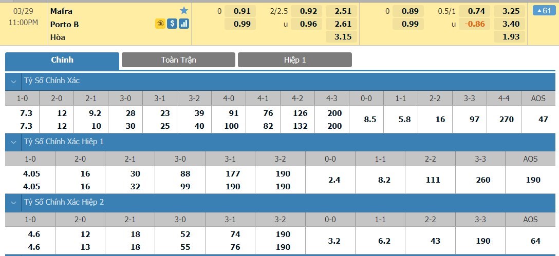 Tỷ lệ kèo cá cược bóng đá trận Mafra vs FC Porto B