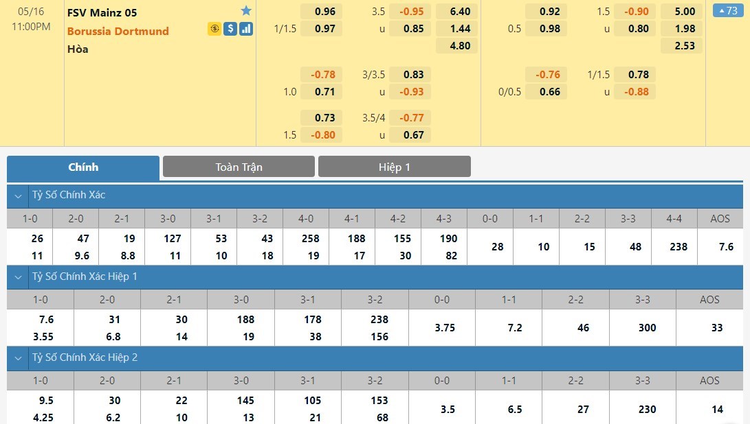Tỷ lệ kèo cá cược bóng đá trực tuyến trận Mainz 05 vs Borussia Dortmund