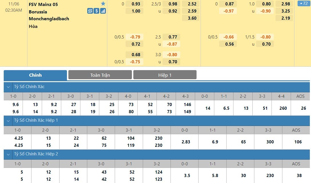 Tỷ lệ kèo cá cược bóng đá trực tuyến trậnMainz 05 vs Borussia Monchengladbach