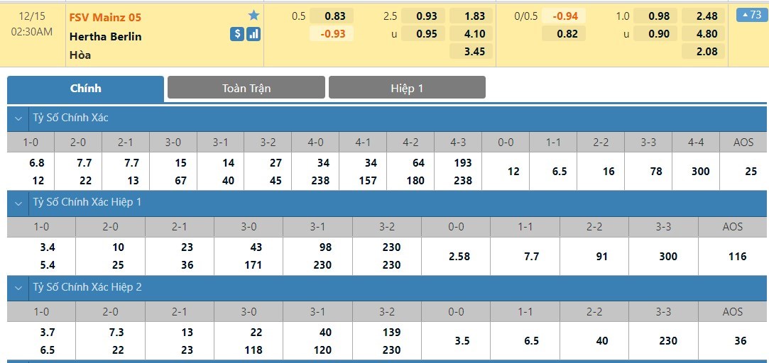 Tỷ lệ kèo cá cược bóng đá trận Mainz 05 vs Hertha Berlin
