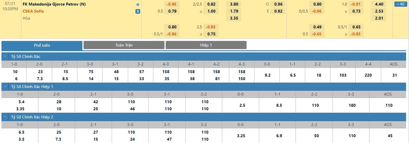 Tỷ lệ kèo cá cược bóng đá trận Makedonija vs CSKA Sofia