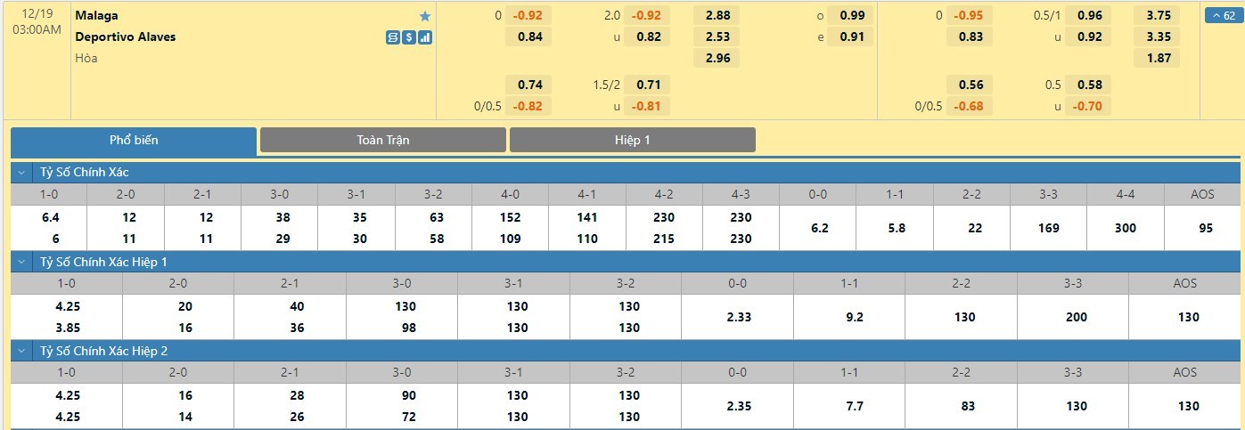 Trong 5 trận đấu gần nhất đối đầu nhau trực tiếp, Malaga chỉ có 1 trận đấu mang về được cho mình ít nhất là 1 bàn thắng trong hiệp đấu đầu tiên. Còn với Alaves, đội bóng này lại thường có thói quen nhập cuộc tốt hơn so với đối thủ. Họ đã có 3 lần là đội vượt lên dẫn trước trong thời gian hiệp đấu đầu tiên ở 5 lần gặp gỡ gần nhất với Malaga. Do vậy với kèo đồng banh thì người chơi nên tin tưởng vào đội khách.