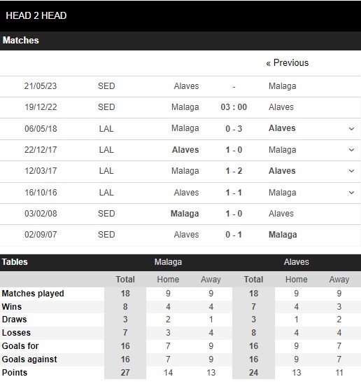 Thống kê đối đầu Malaga vs Deportivo Alaves