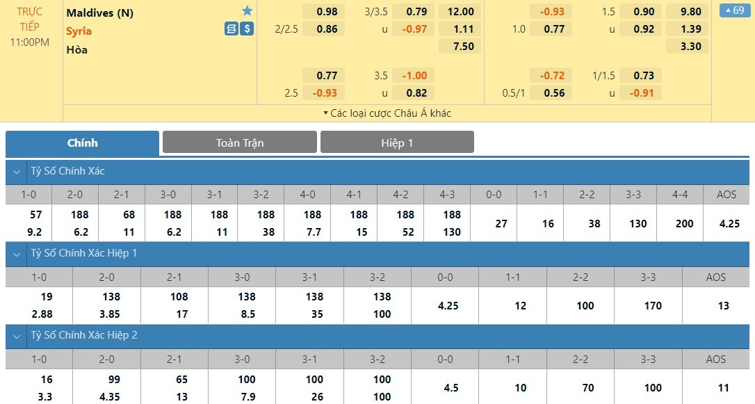 Tính tới thời điểm hiện tại Syria cùng với Nhật Bản là 2 cái tên duy nhất toàn thắng ở tất cả các lượt trận của mình. Điều đó đủ cho thấy sức mạnh của thầy trò Ayman Hakeem là cực kỳ đáng sợ và rõ ràng Maldives không phải là đối thủ xứng tầm với họ. Hơn nữa phong độ của Maldives cũng không thật sự đem lại quá nhiều hy vọng. Do đó ở kèo đấu tới thì Syria vẫn là lựa chọn an toàn hơn cho người chơi.