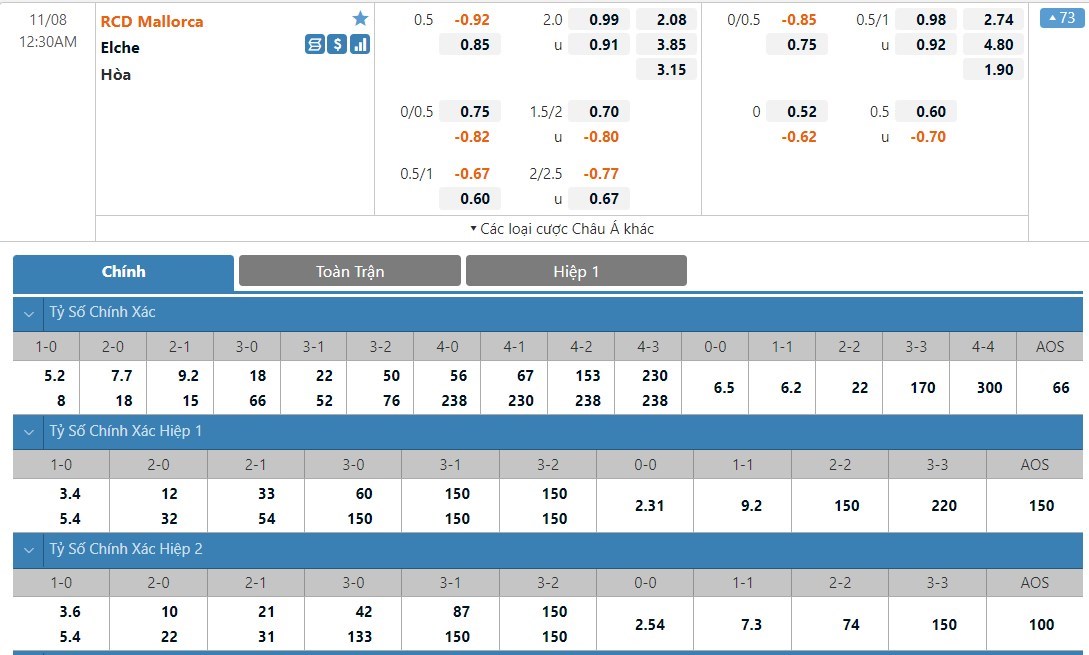Tỷ lệ kèo cá cược bóng đá trận Mallorca vs Elche