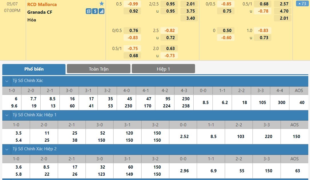 Tỷ lệ kèo cá cược bóng đá trực tuyến trận Mallorca vs Granada