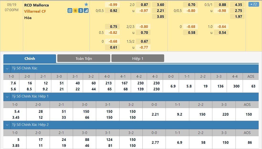 Tỷ lệ kèo cá cược bóng đá trận Mallorca vs Villarreal