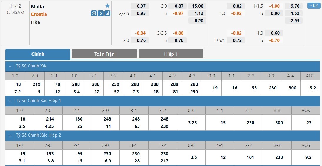 Tỷ lệ kèo cá cược bóng đá trực tuyến trận Malta vs Croatia