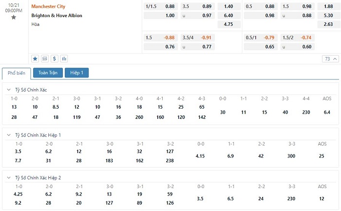 Tỷ lệ kèo cá cược bóng đá trực tuyến trận Manchester City vs Brighton