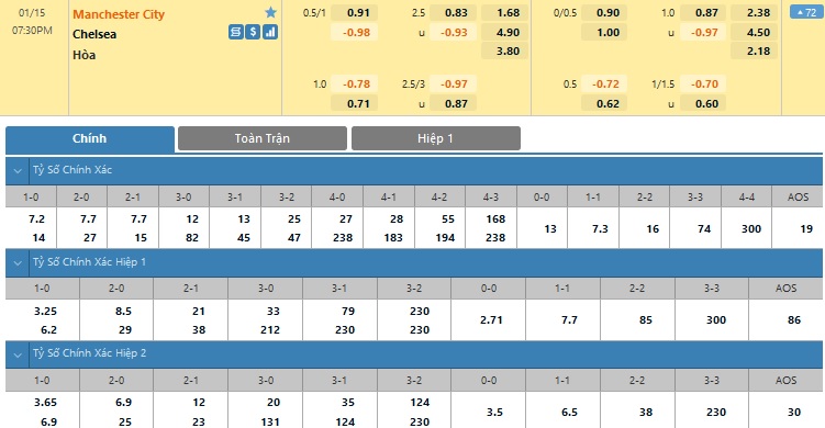 Xem tỷ lệ kèo cá cược bóng đá trực tuyến Manchester City vs Chelsea