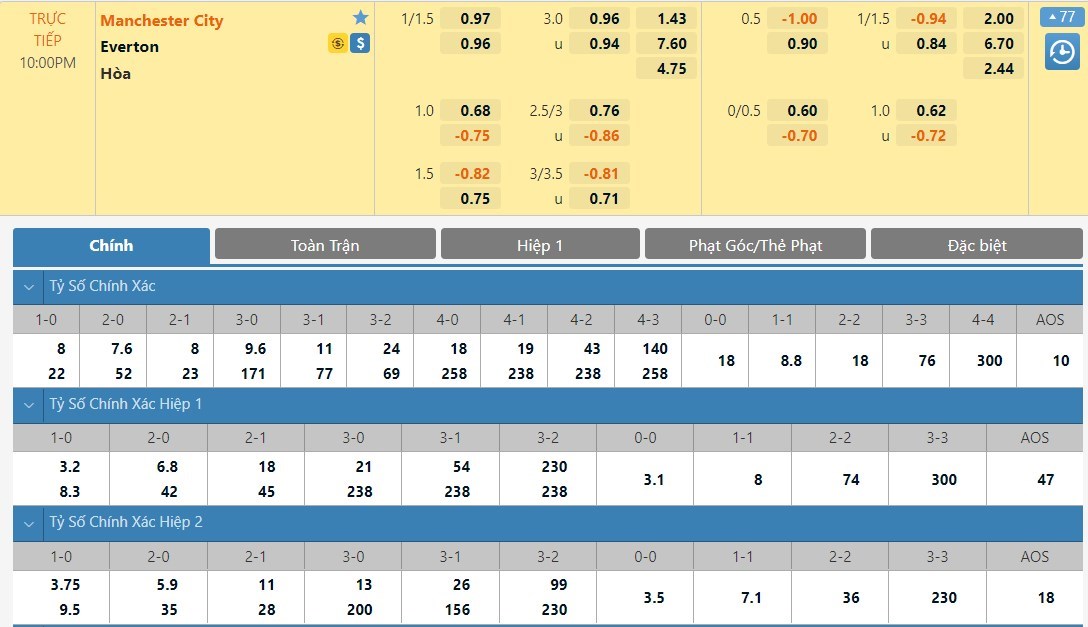 Tỷ lệ kèo cá cược bóng đá trực tuyến trận Manchester City vs Everton