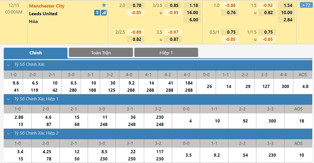 Tỷ lệ kèo cá cược bóng đá trực tuyến trận Manchester City vs Leeds