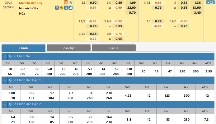Xem tỉ lệ kèo cá cược bóng đá trực tuyến Manchester City vs Norwich