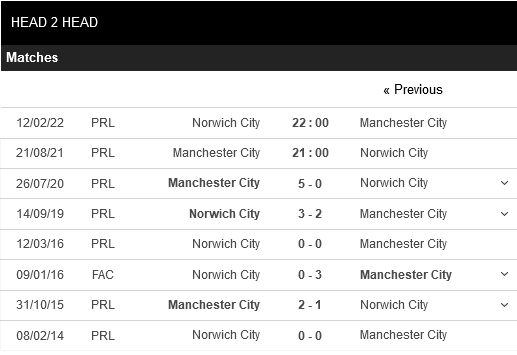 Thống kê đối đầu Manchester City vs Norwich