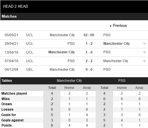 Thống kê đối đầu Manchester City vs Paris Saint-Germain