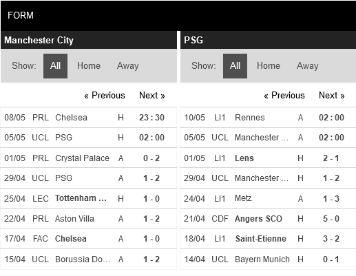 Thống kê phong độ Manchester City vs Paris Saint-Germain