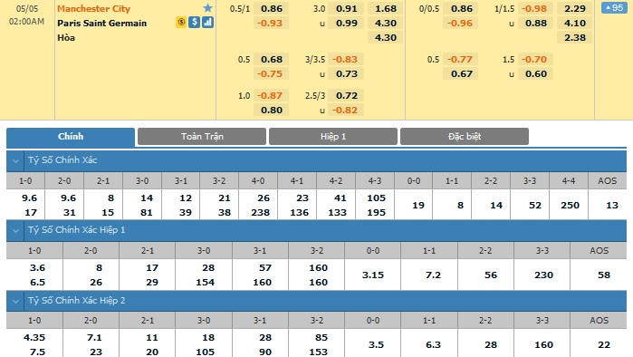 Xem tỉ lệ kèo cá cược bóng đá trực tuyến Manchester City vs Paris Saint-Germain