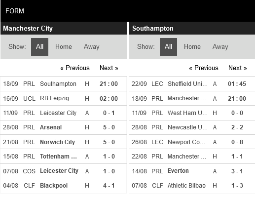 Thống kê phong độ Manchester City vs Southampton