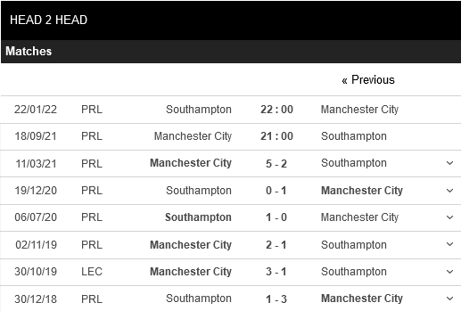 Thống kê đối đầu Manchester City vs Southampton